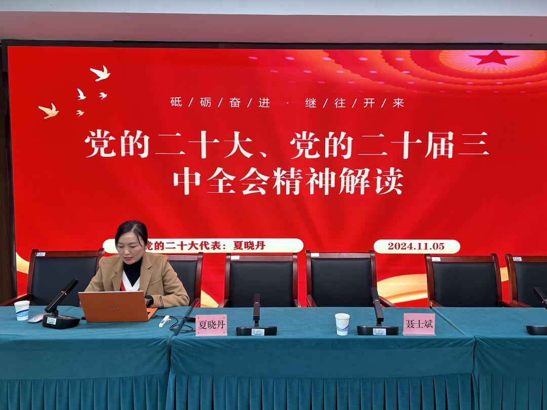 宣讲报告会内容分为两部分,第一部分夏晓丹结合党的二十大参会的经历、体会、感悟,结合自身工作,围绕党的二十大的重大意义,中国式现代化的本质要求、全面建设社会主义现代化国家的首要任务和“五个必由之路”等重点内容,对党的二十大精神进行系统宣讲和深入阐释。第二部分从党的二十届三中全会重要意义、习近平总书记在党的二十届三中全会上重要讲话精神、全面准确理解《中共中央关于进一步全面深化改革、推进中国式现代化的决定》提出的进一步全面深化改革重大举措、抓好党的二十届三中全会精神贯彻落实等四个部分,对党的二十届三中全会精神进行了深入系统解读。