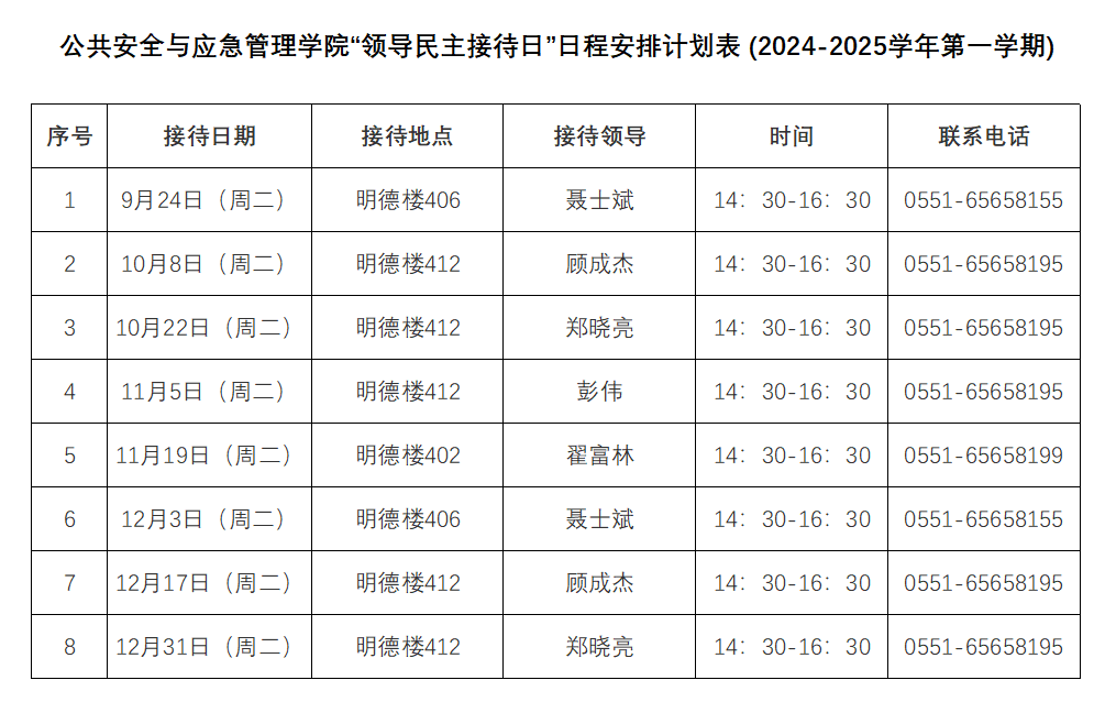 为进一步加强学院党政领导干部作风建设,认真听取和吸纳来自学院各方对教学、管理等工作的建议或意见,密切学院领导与广大师生员工的联系,及时解决工作中存在的问题,不断改进工作作风,强化监督力度,营造民主、团结、和谐的办学氛围,推进学院各项事业健康科学发展,特制定《公共安全与应急管理学院领导民主接待日工作制度》(公应发〔2024〕10 号)(见附件)。现将本学期院领导接待日有关工作安排通知如下: