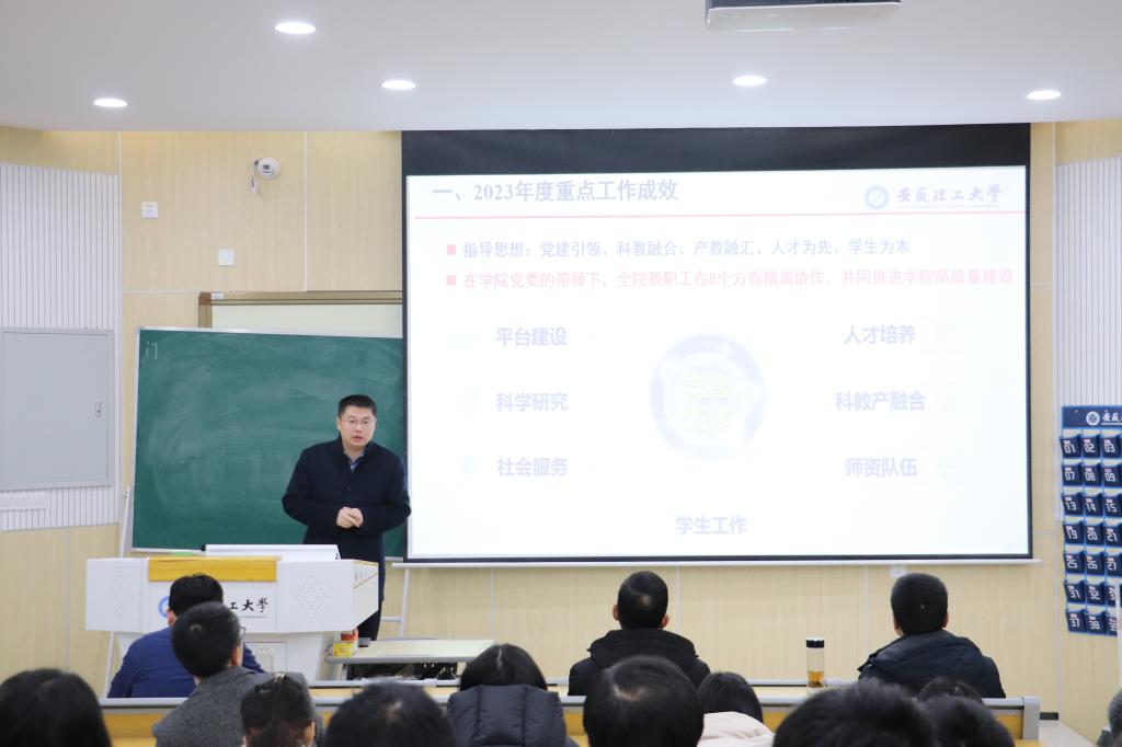 顾成杰对学院2023年工作进行总结,并通报2024年工作思路。顾成杰从平台建设、人才培养、科学研究、科教产融合、社会服务、师资队伍以及学生工作等七个方面全面总结了学院2023年的主要工作和取得的成绩,对学院2024年重点工作进行了部署。要求全院教师在科学发展、高层次人才引进与培养、国家级项目及基金、教学与科研平台、国际交流与合作及学院文化氛围方面要再发力、再提升,争取新的一年学院各项工作能取得更大突破。