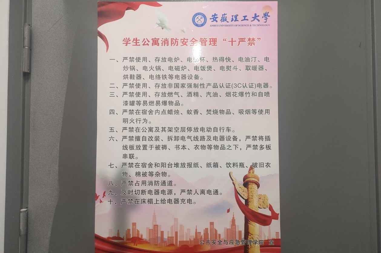 同时,学院制作并发布了学生公寓消防安全管理“十严禁”海报,以直观的方式告诫学生注意消防安全,并要求张贴于宿舍的显眼位置,强化学生对安全规定的记忆,有效规范日常生活用电行为,从根源上杜绝安全隐患的滋生。