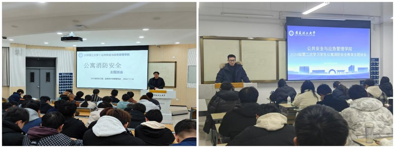 11月26日及12月9日期间,学院多管齐下,全方位推进宿舍安全教育工作,各年级辅导员精准发力,分别组织宿舍安全教育主题班会,确保安全教育落到实处。会上,辅导员带领学生深入学习《安徽理工大学学生公寓消防安全责任制实施办法》,讲解宿舍用电安全规范及火灾预防要点,教授学生识别和处理宿舍中的火灾隐患,增强学生的自我保护能力,强化其安全责任意识。此外,学院还制定了《遵守学生公寓安全规定承诺书》并要求每位学生签署,共同维护宿舍的安全与和谐,将安全文明准则深植心间,合力构筑宿舍安全文明的坚固堡垒。