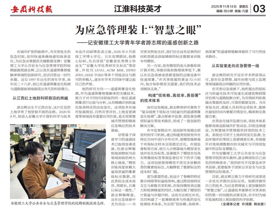 近日,《安徽科技报》以专栏形式专题报道了学院青年教师游志辉博士在遥感图像智能解译领域的研究成果及学术探索历程。