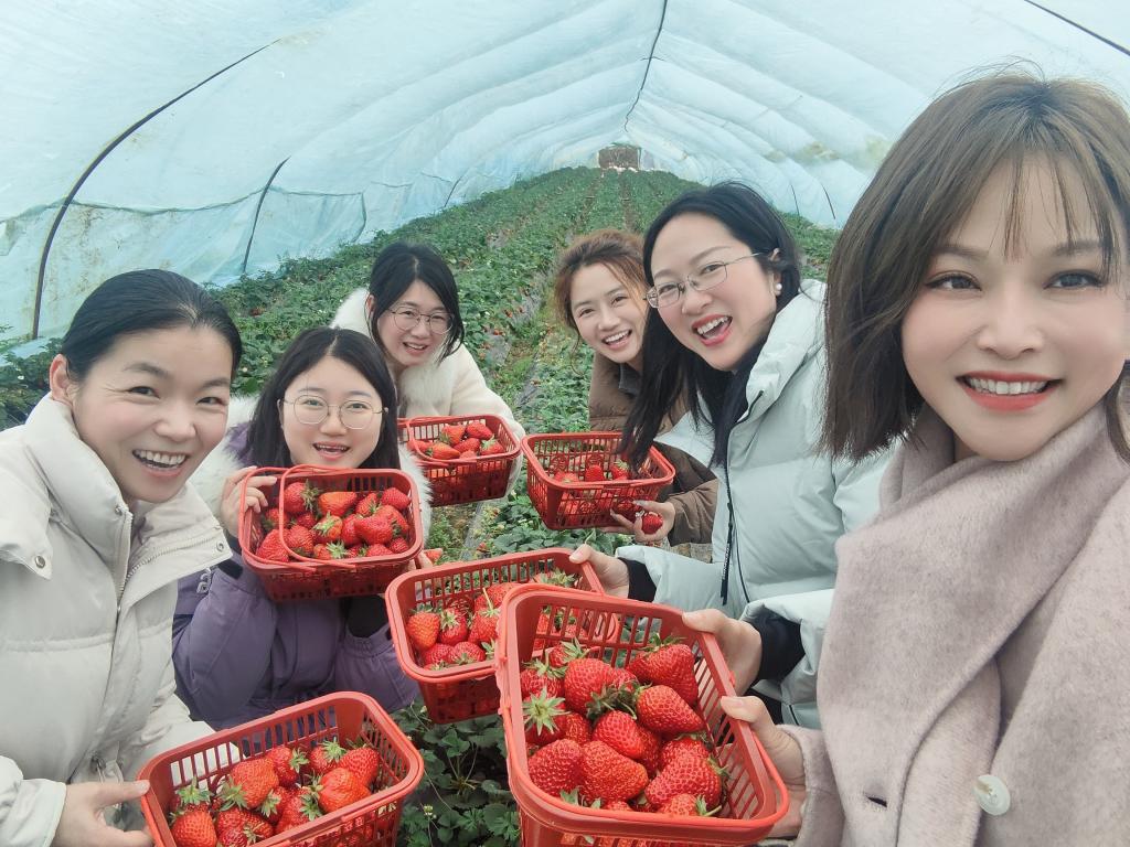 下午13:30,参与活动的女教职工们自驾前往采摘园,满怀期待开启本次采摘之旅。抵达目的地后,大家先听采摘园工作人员介绍园内草莓的品种、采摘技巧及大棚内的注意事项,随后自由分组进入草莓大棚,开启了趣味十足的采摘体验。女教职工们一边细心挑选、采摘成熟的草莓,一边相互交流、拍照留念,欢声笑语回荡在大棚里,尽情享受着采摘的乐趣和亲近自然的美好。