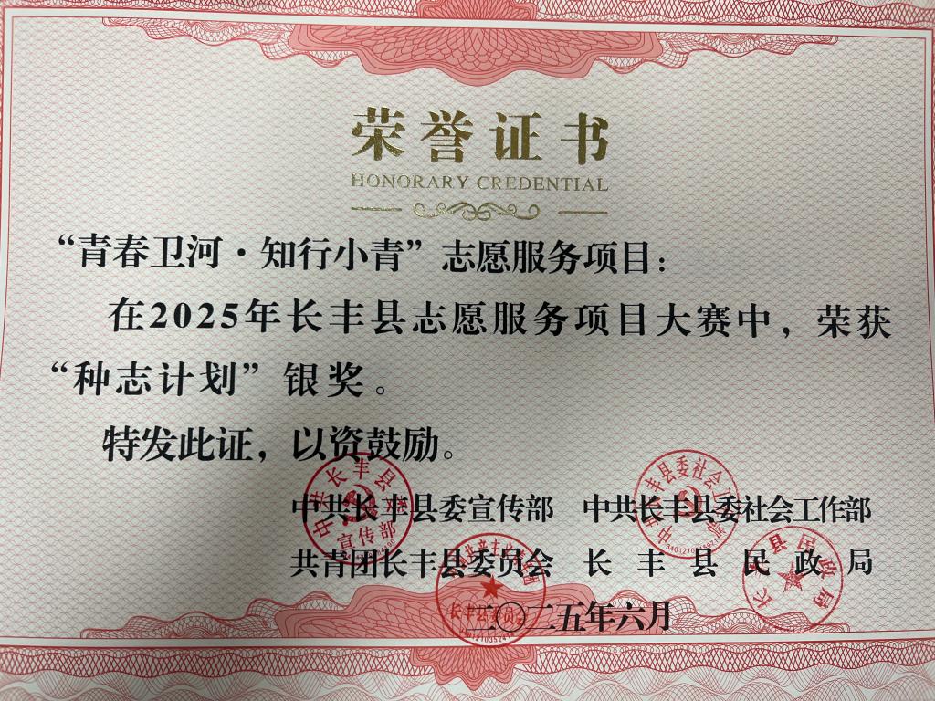 志愿服务是社会文明进步的生动注脚,更是温暖人心的力量纽带。为了展现学院志愿精神的时代风采,培育优秀志愿服务项目,提升学院志愿服务标准化、品牌化、项目化、专业化水平,持续打造志愿服务品牌,学院与长丰县生态环境分局联合申报“青春卫河·知行小青”志愿服务项目,组织陈佳、郑昕然、田涛、汤轲、李韵涵、孙欣冉、苏乐等同学代表学院参加2025年长丰县志同道合·丰行益善志愿服务项目大赛,荣获“种志计划”银奖,项目获批经费1.4万元。