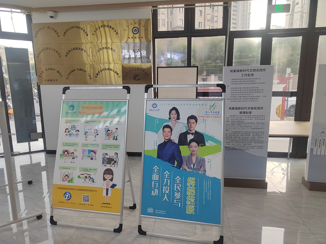 志愿队姚俊同学开展了应急科普实操,通过视频演示和假人心肺复苏实操,指导掌握心肺复苏技能,参与者通过胸外按压、人工呼吸等练习,切实掌握急救技能,现场互动热烈,学习氛围浓厚,生动呈现了理论与实践结合的互动实效。志愿者们还在学校内张贴结核病防治宣传海报,营造浓厚的宣传氛围,随后奔赴岗集镇邻里中心,开展了宣传活动并赠送了宣传展板。