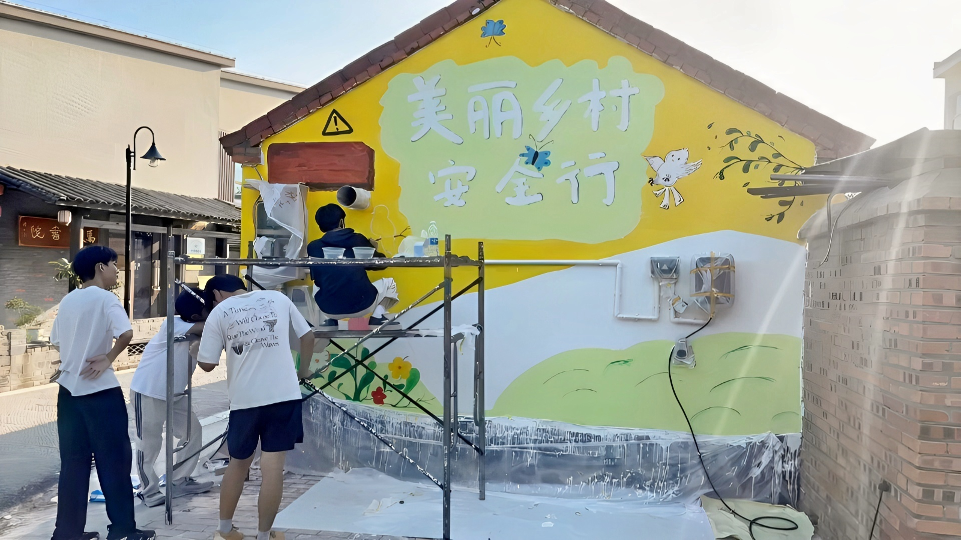 6月30日,团队克服阴雨天气,开展了“美丽乡村,安全行”主题的墙体彩绘活动,将安全元素与农耕符号融合。最终,呈现出兼具教育与艺术的文化墙,成为一道亮丽的风景线。
