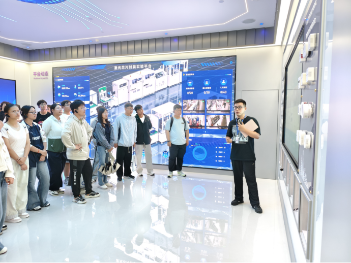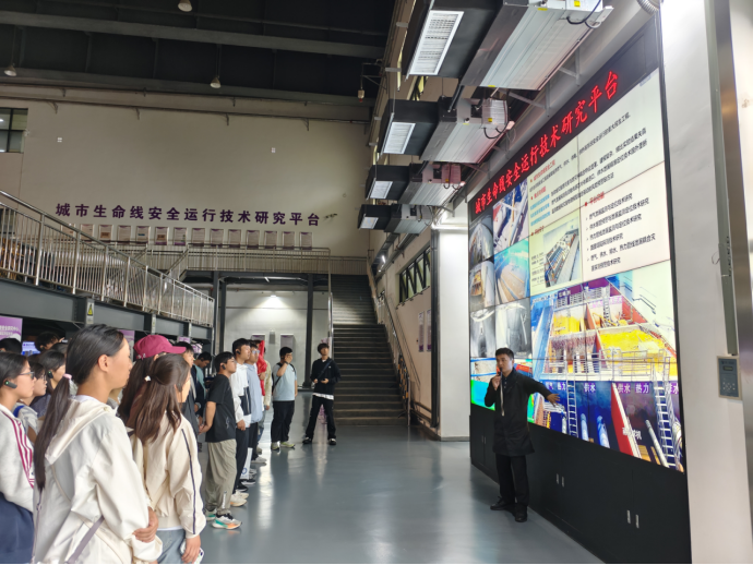 随后,研究院讲解员围绕“科技赋能公共安全”主题,系统介绍了研究院在城市安全、灾害治理、应急技术等方面的创新成果与实践案例。在专业展厅内,同学们认真观摩了城市生命线安全运行监测技术平台、激光芯片封装实验平台等核心装备,并通过动态演示直观了解极端气象灾害预警、电化学能源消防安全等场景的技术实现路径。现场互动积极,研讨氛围热烈。
