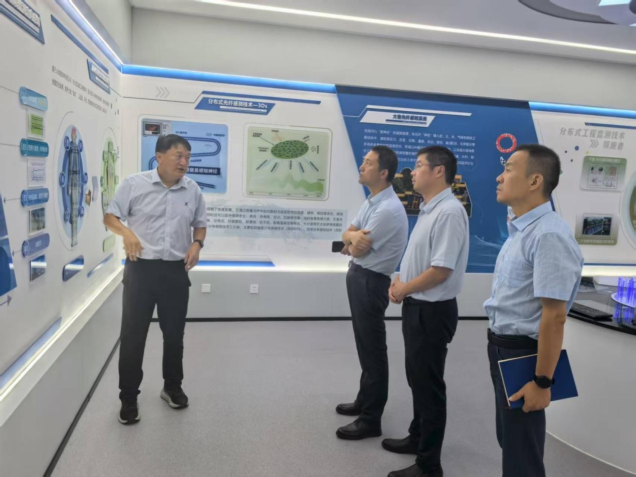 顾成杰一行在魏广庆陪同下,参观了公司展厅与生产车间。他细致了解公司核心技术优势与未来发展规划,并就光纤在隧道变形、边坡稳定、矿山工程及城市安全等场景的监测预警应用,与公司技术人员深入交流,对相关技术在实际场景中的应用效果和潜力有了更直观的认识。